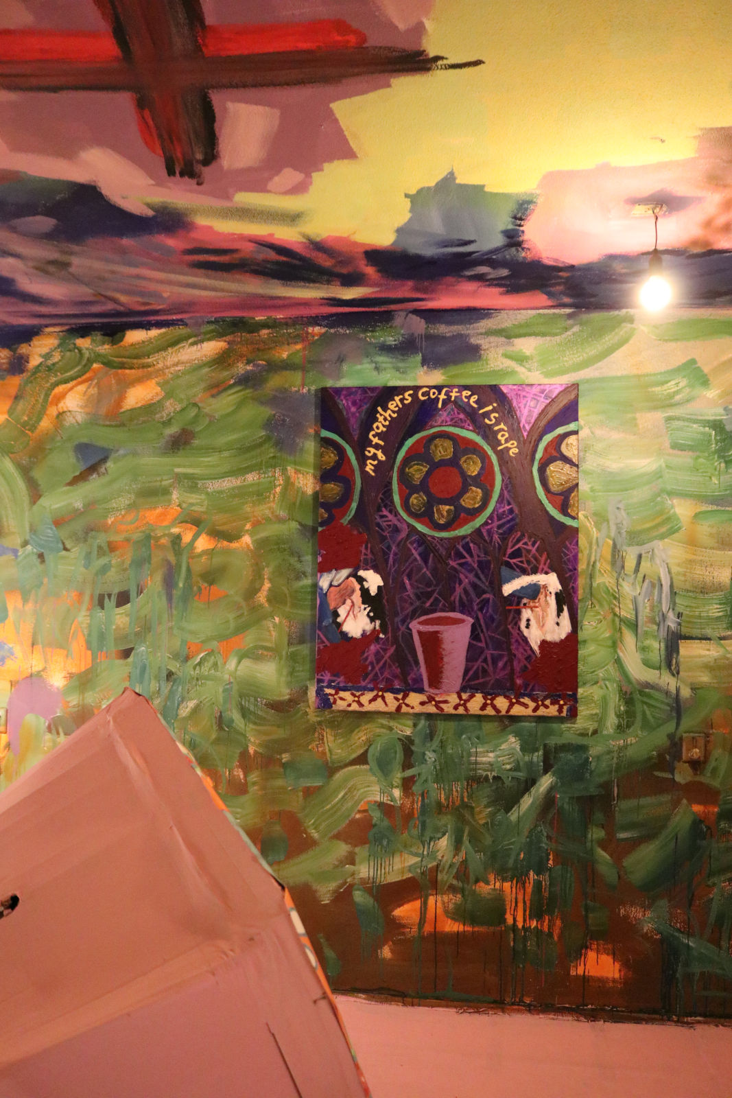 Veganism as in dark fairytale is a cooperation between my partner Marije Rat and me. We both are artist and vegan. Veganism plays an important role in our relationship and we decided to make an exhibition about it in our home. In this exhibition we wanted to express our experiences, our anger and sadness concerning animal abuse and at the same time give free space to our artistic impulses and imagination. We live in a regular house and we wanted to get rid of this normality. We blocked the windows with wooden panels so there was no daylight. We covered the floor with cardboard and we painted all the walls and ceiling. We did this because there is no normality that can be seen as a save and peaceful standard. Normality is brutal truth kept out of sight.