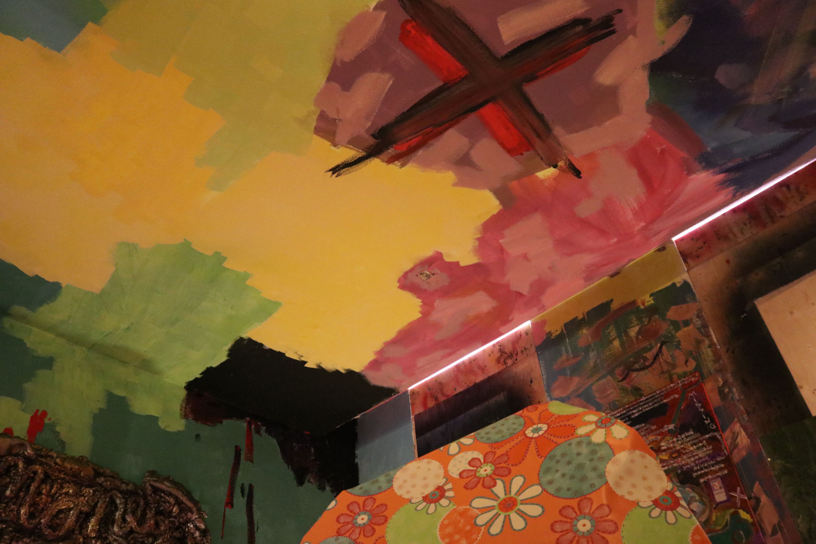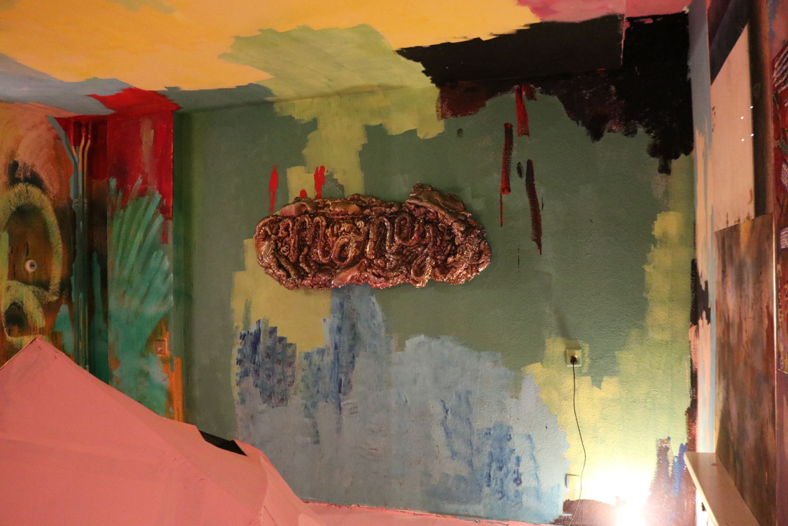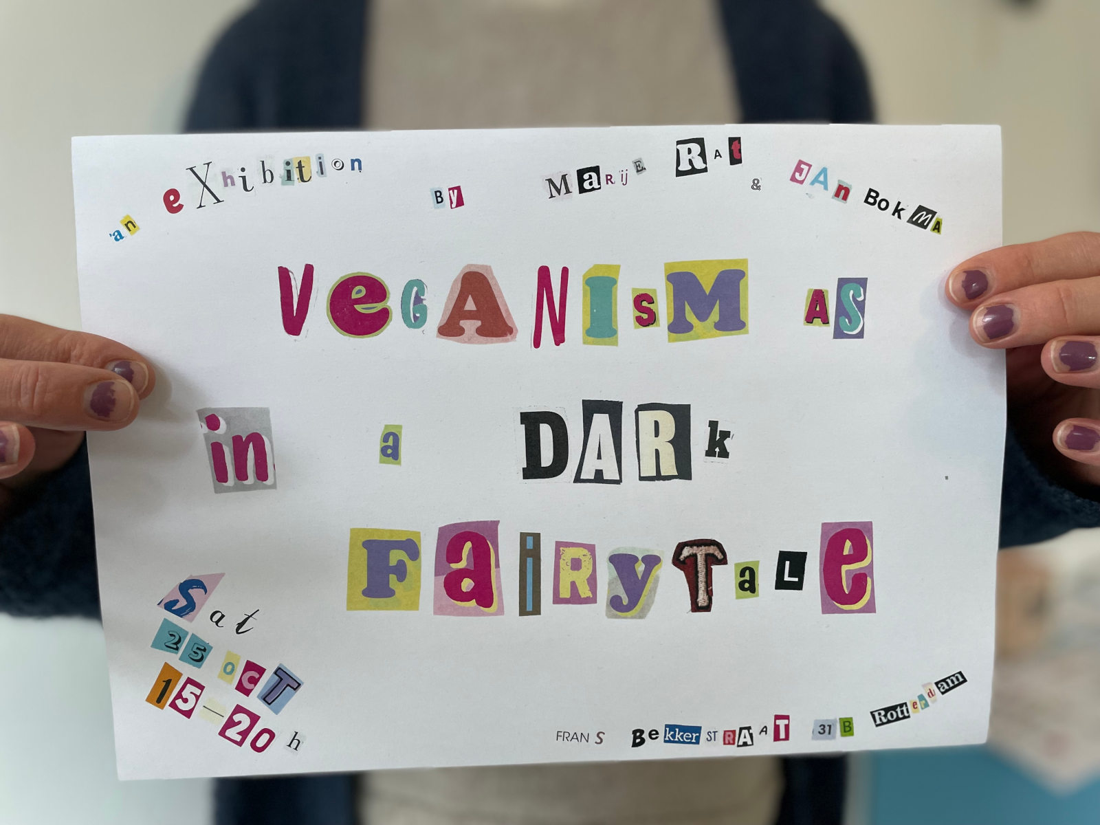Veganism as in dark fairytale is a cooperation between my partner Marije Rat and me. We both are artist and vegan. Veganism plays an important role in our relationship and we decided to make an exhibition about it in our home. In this exhibition we wanted to express our experiences, our anger and sadness concerning animal abuse and at the same time give free space to our artistic impulses and imagination. We live in a regular house and we wanted to get rid of this normality. We blocked the windows with wooden panels so there was no daylight. We covered the floor with cardboard and we painted all the walls and ceiling. We did this because there is no normality that can be seen as a save and peaceful standard. Normality is brutal truth kept out of sight.