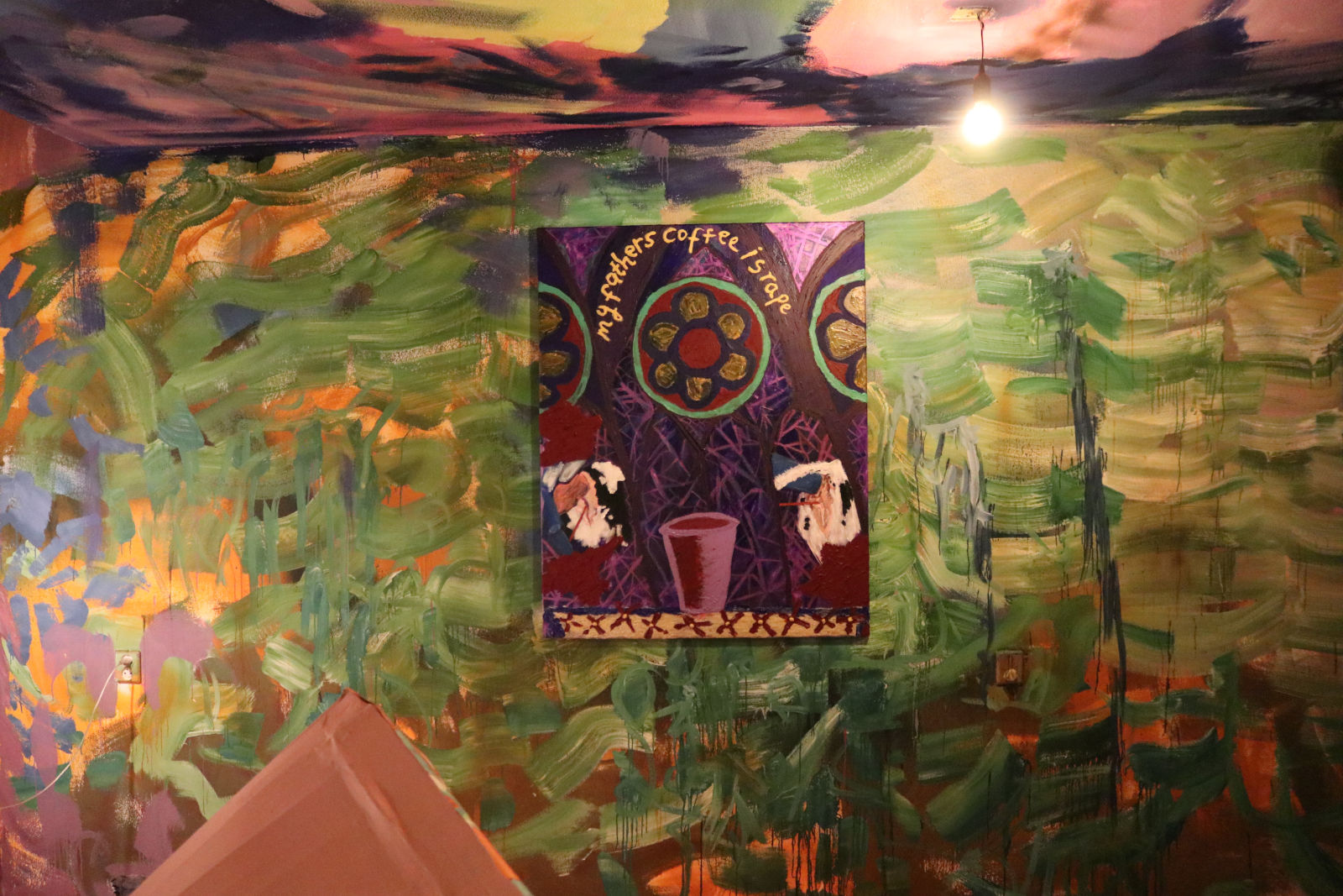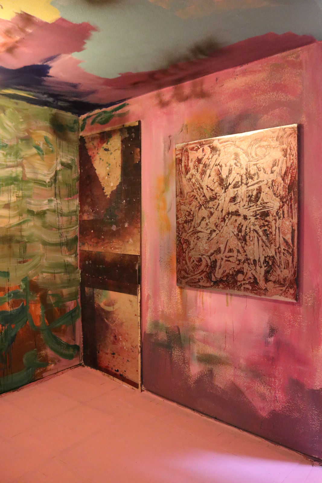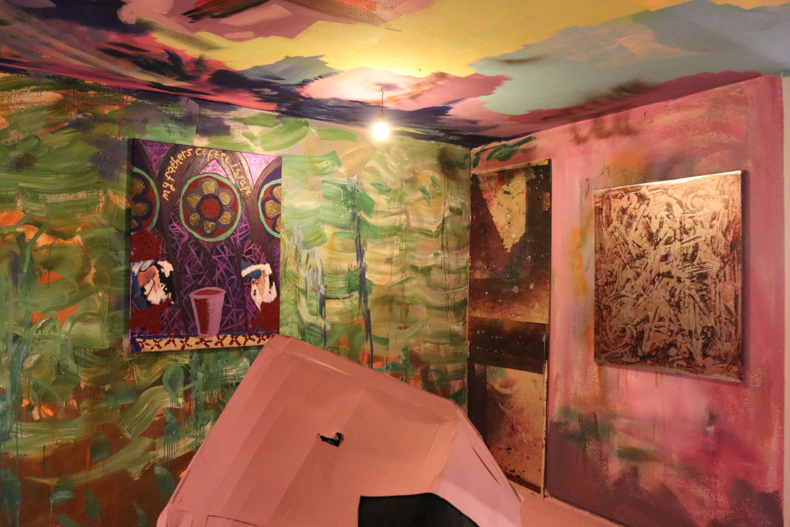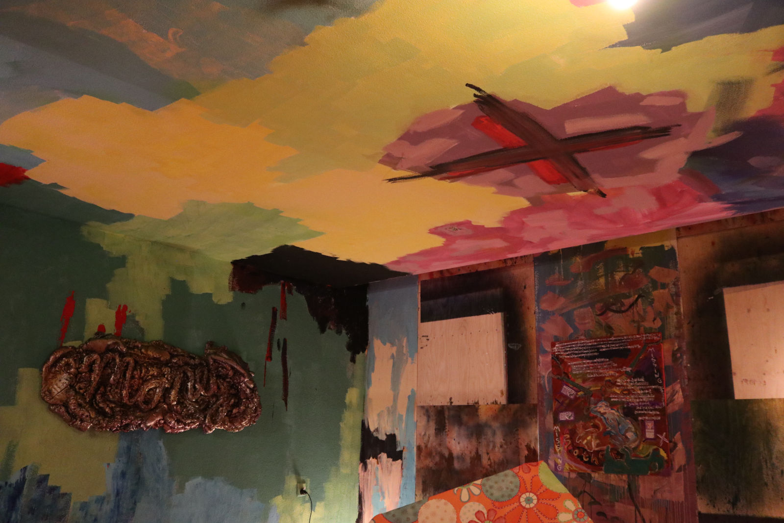 Veganism as in dark fairytale is a cooperation between my partner Marije Rat and me. We both are artist and vegan. Veganism plays an important role in our relationship and we decided to make an exhibition about it in our home. In this exhibition we wanted to express our experiences, our anger and sadness concerning animal abuse and at the same time give free space to our artistic impulses and imagination. We live in a regular house and we wanted to get rid of this normality. We blocked the windows with wooden panels so there was no daylight. We covered the floor with cardboard and we painted all the walls and ceiling. We did this because there is no normality that can be seen as a save and peaceful standard. Normality is brutal truth kept out of sight.